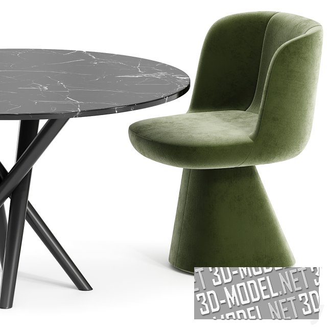 Monica Armani). Круглая столешница стола опирается на комбинацию из четырех наклонно установленных черных ножек. Габарит стола: d194,8/h73,3см. Опора стула в виде чуть наклоненного усеченного конуса, его мягкое сиденье и огибающая спинка обиты оливковым велюром. Габарит стула: d60/h73см. Высота сиденья - 46см.