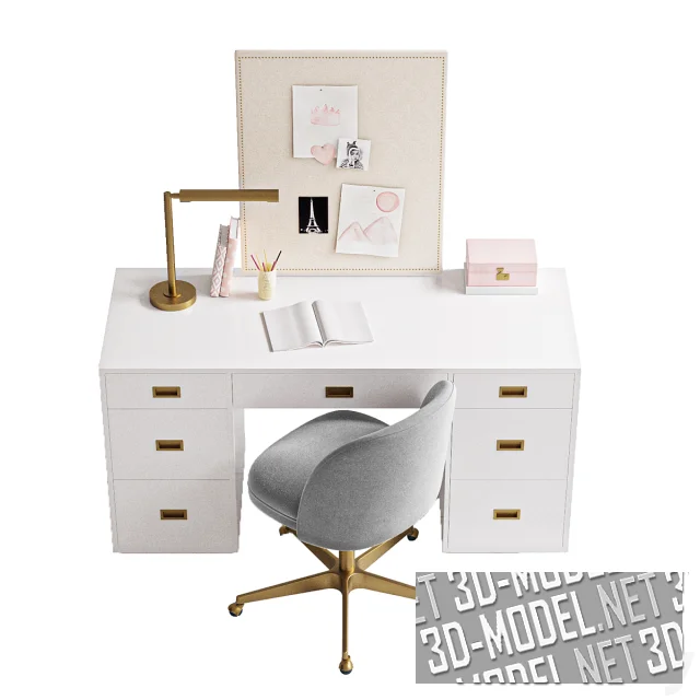 Стильный комплект мебели для элегантного пространства, содержит стол AVALON и стул ALESSA от Restoration Hardware. Стол белого цвета, стул с серой текстильной обивкой. Ручки стола, основа стула и настольная лампа перекликаются цветом отделки. Предметы декора и настольные аксессуары создают дополнительный реализм.