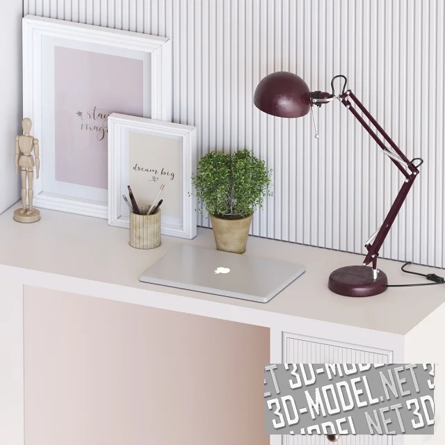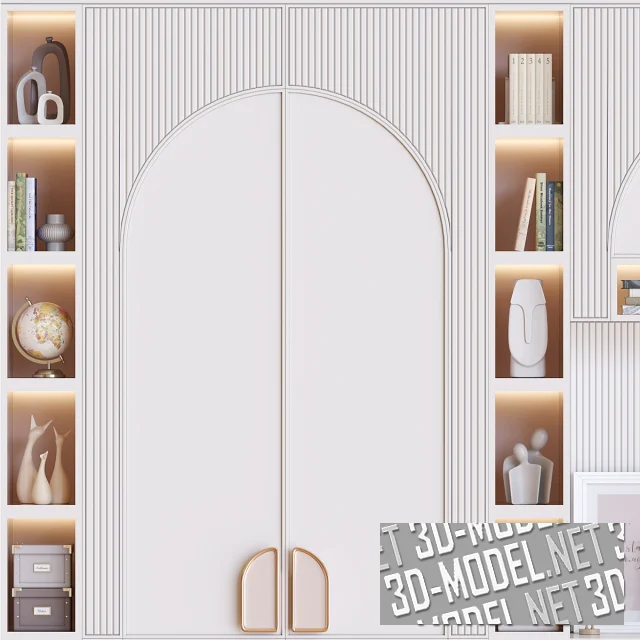 Современная мебель со шкафом, полками, настольной лампой Forsa от IKEA (dark red 40457295) и письменным столом. Плоскости фасадов и стена над столом декорированы белыми панелями с 3D-фрезеровкой с вертикальными канавками. На створках шкафов выделены гладкие арочные плоскости с золотистыми ручками. Узкие секции с открытыми полками подсвечены скрытой подсветкой. На полках: книги, декоративные коробки, глобус, керамика. На столе ноутбук, зеленое мелколистное растение в горшке, пара белых фоторамок, стакан с ручками и карандашами, деревянная шарнирная фигурка-человечек.