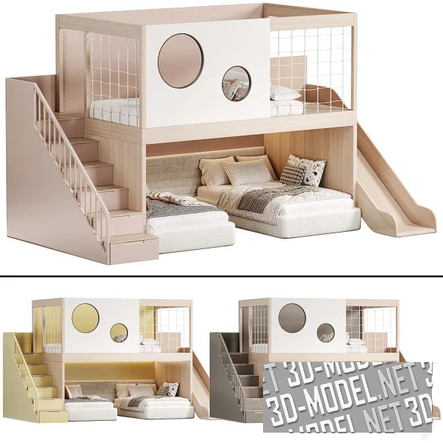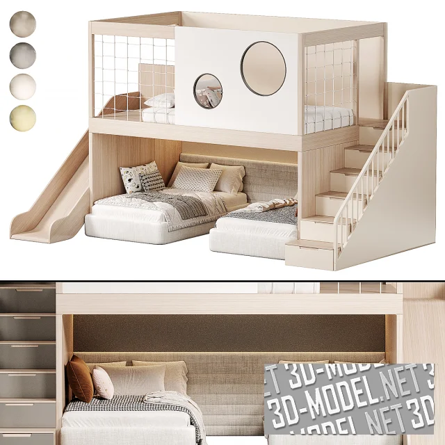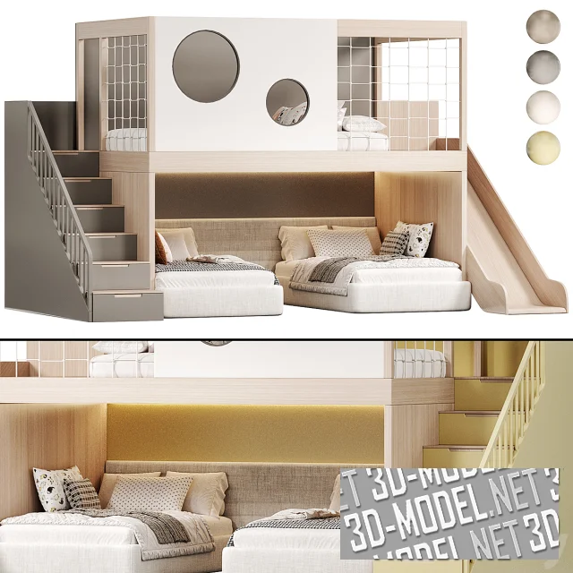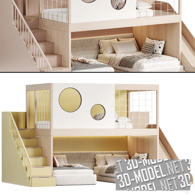 Двухъярусная мебельная конструкция светлого цвета для интерьера современной детской спальни. На полу второго яруса, огороженного панелью и веревочной сеткой, лежит белый матрас с подушкой. Под ярусом справа и слева находятся два спальных места. С одной стороны на верхний ярус ведет лестница с перилами. Ступеньки представляют собой выдвижные ящики для хранения. С другой стороны смонтирована небольшая горка.