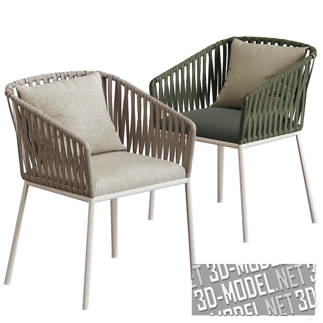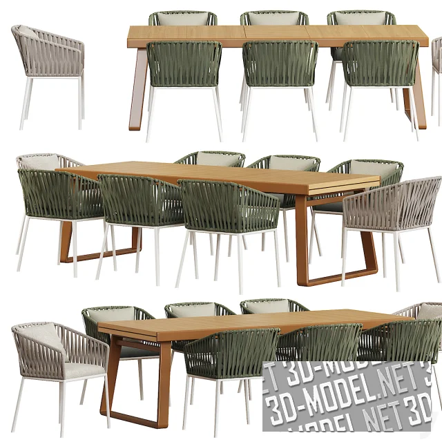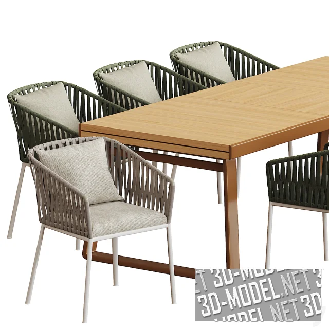 Комплект обеденной мебели со стульями Bela Rope и раздвижным прямоугольным обеденным столом BITTA от Kettal (дизайнер: Rodolfo Dordoni). Стол со столешницей из светлого желтоватого дерева на светло-коричневых опорах регулируется на 8-12 человек. Каркас огибающей спинки кресел и ножки выполнены из металлической трубы. Плоскости спинки, переходящей в подлокотники созданы из переплетенных текстильных ремней. Мягкие сиденья обиты текстилем. К спинке прислонена подушка в цвет обивки сиденья. Представлены два вида кресел: бежевая оплетка, обивка бледно-песочного цвета на белом каркасе и болотно-зеленая оплетка с темно-оливковой текстильной обивкой на белом каркасе.