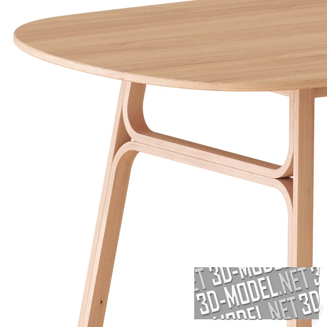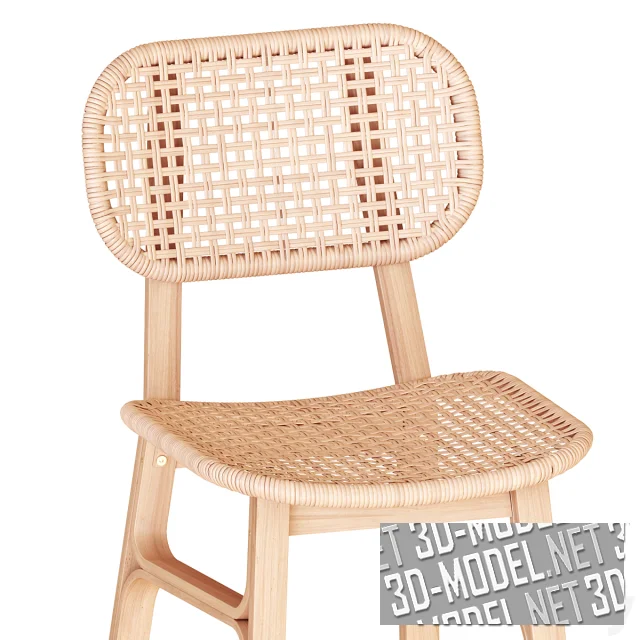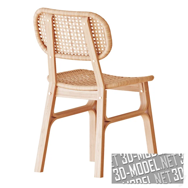 Набор обеденной мебели (стол и стулья VOXLOV, стулья ODGER от IKEA) в эко-стиле, в сочетании светлой бамбуковой древесины, ротангового плетения и зеленого пластика. Из гнутых бамбуковых реек и бруса выполнены обеденный стол (180х90х75см) и стулья (42,9х53х85см) VOXLOV. Овальные горизонтальные спинки и сиденья стульев заполняет плетение из ротанга. Ярким цветовым пятном в сцене служат два пластиковых литых стула ODGER (45х51х81см) с матовой поверхностью травянисто-зеленого цвета.