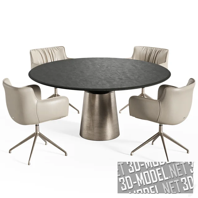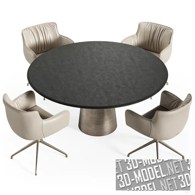 Yoda Argile – это круглый обеденный стол с центральным усеченным конусом. Длинная элегантная шейка, поддерживающая столешницу (в различных землистых и натуральных оттенках) смотрится стильно и интересно. Rhonda — дизайнерское вращающееся кресло с четырехспицевым основанием. Гармоничный сет для современного пространства.