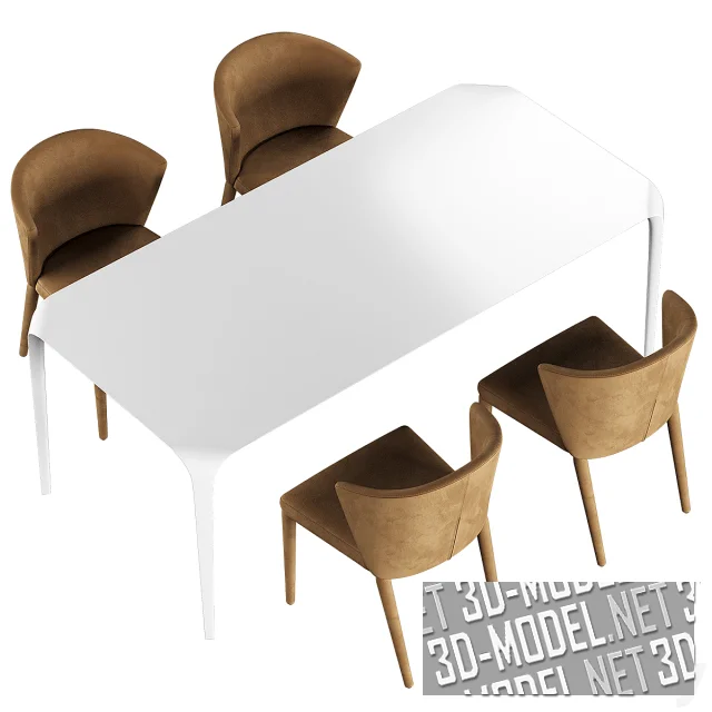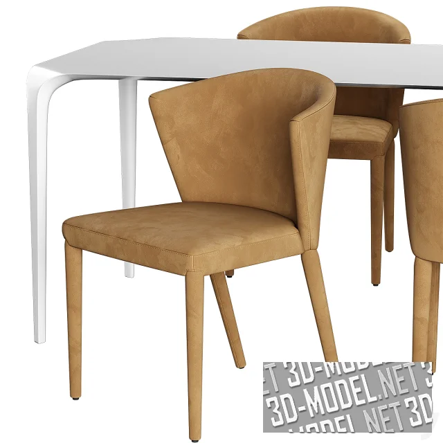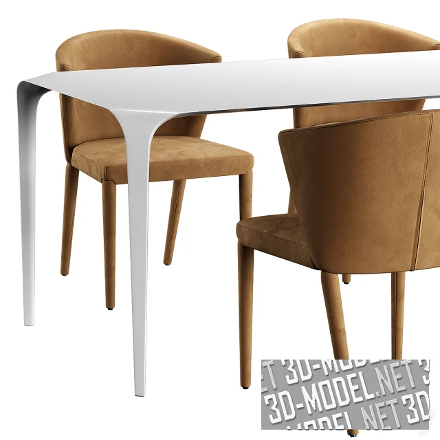 Стулья Amelie от итальянской фабрики Calligaris с охристой кожаной обивкой и стол Link в современном стиле образуют стильную дизайнерскую мебельную группу. Гладкий белый стол на четырех ножках плавно «перетекающих» из столешницы имеет размер 190х90х73см. Стулья отличаются невысокой спинкой с вертикальным швом на задней плоскости. Габарит стула: 53х57х76см.