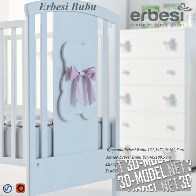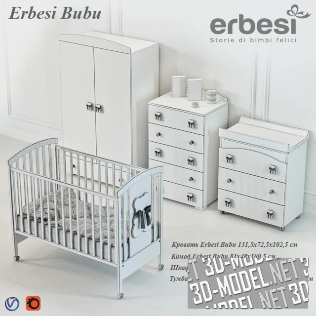 Комплект белой мебели в детскую комнату - Bubu от Erbesi. В наборе кроватка с бортами (131,5х72,5х102,5см), платяной двухстворчатый шкаф (100х55х177см), комод с пятью выдвижными ящиками (72х50х121,5см), пеленальный столик-тумба с тремя выдвижными ящиками (81х48х100,5см). В качестве декоративного элемента в мебели выступает белый силуэт медвежонка с сиреневым бантом на шее. Этот элемент просматривается в виде ручек на фасадах и в виде декора на одной из коротких бортов кровати. Кровать дополнена стеганым одеялом и матрасом. На комоде - детское питание в коробках.