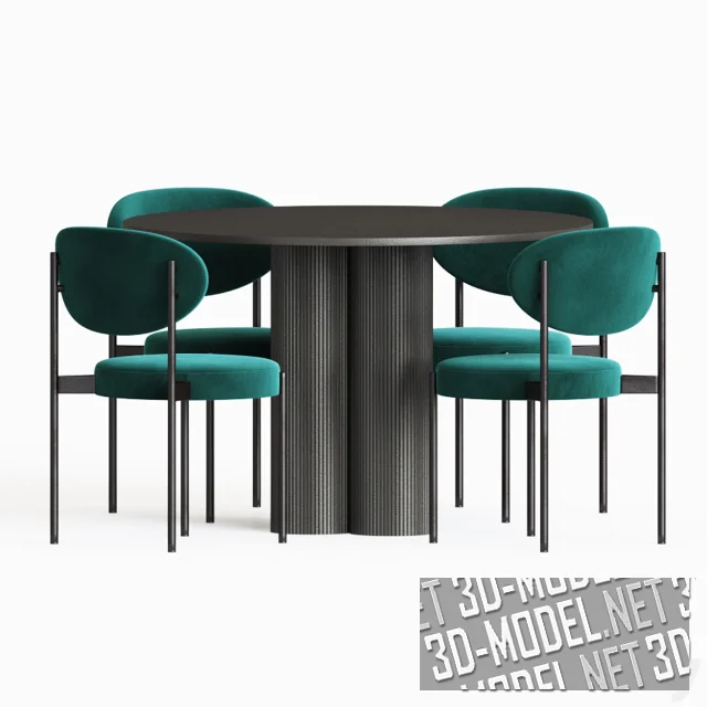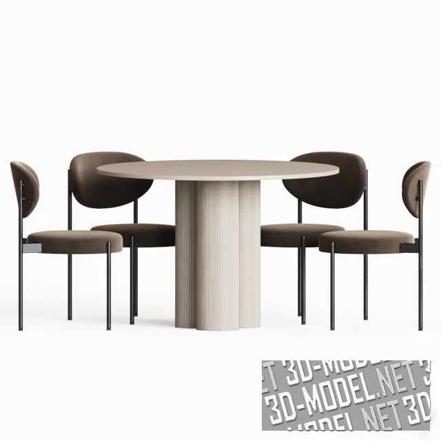 Современный обеденный комплект мебели 69 от Corner design - круглый стол из четырех слитых в одну опору цилиндров и мягкие стулья. Стулья (габарит: 37х40х80см) с мягким круглым сиденьем и овальной горизонтальной спинкой на черных ножках из металлических трубок. Габарит стола: d80/h78см. Опора декорирована вертикальными канавками. Представлены два комплекта мебели. Первый вариант: светло-бежевый стол и стулья с коричневой обивкой. Второй: графитово-черный стол и бархатная обивка темно-бирюзового цвета на стульях.