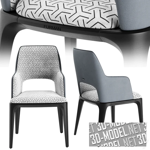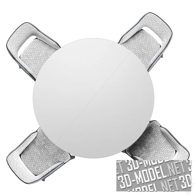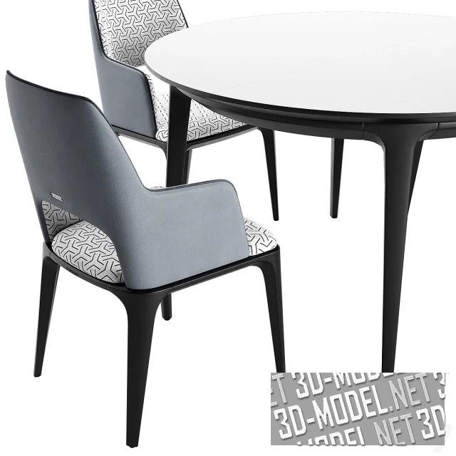 Раскладной (круглый-овальный) современный обеденный стол и стулья Play, с черными ножками и основаниями из массива ясеня. Верхняя плоскость столешницы белая (d125см), основа черная, с широкой фацетой снизу. Мягкое сиденье стульев и внутренняя плоскость огибающей спинки, переходящей в прямые подлокотники, обиты белым текстилем с черным контурным геометрическим паттерном на тему гексаэдров. Наружная плоскость спинки и подлокотников серого цвета, текстурированная, отделена от белой обивки черной вставкой. Габарит стула: 50х55х84см.