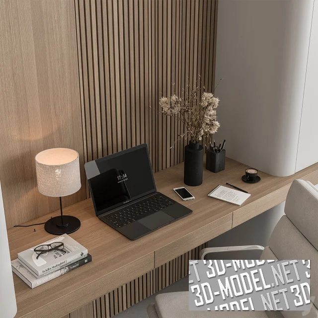 Передние вертикальные грани шкафов сильно скруглены, создавая мягкий силуэт. В средней части левого шкафа обустроена секция с открытыми полками. Столешница письменного стола глубоко интегрирована в шкафы, размещенные справа и слева. На полках шкафа книги, керамические вазы, настольный телескоп, современные настольные скульптуры (носорог, птичка, человеческие бюсты, ретро-велосипед). На столе ноутбук, черная ваза с сухим букетом, черный квадратный стакан с карандашами, книги, блокнот, черная чашка на блюдце, очки, настольная лампа с цилиндрическим тканевым абажуром светло-бежевого цвета.