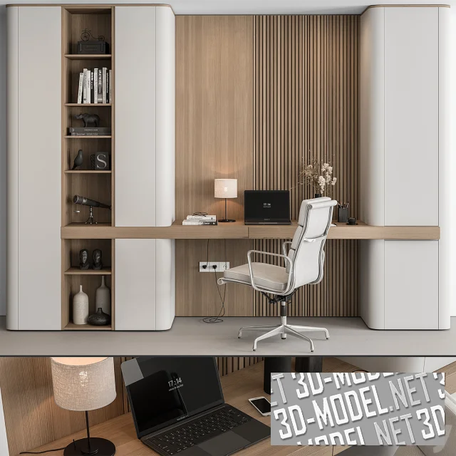 Современный мебельный блок для обустройства домашнего офиса с письменным консольным столом, шкафами, полками и офисным креслом, аксессуарами и декором. Корпуса мебели выполнены из белого материала с вставками из плит с текстурой дерева. Столешница с невысоким выдвижным ящиком и стенка между шкафами тоже из дерева. Часть стенки декорирована вертикальной реечной наборкой.