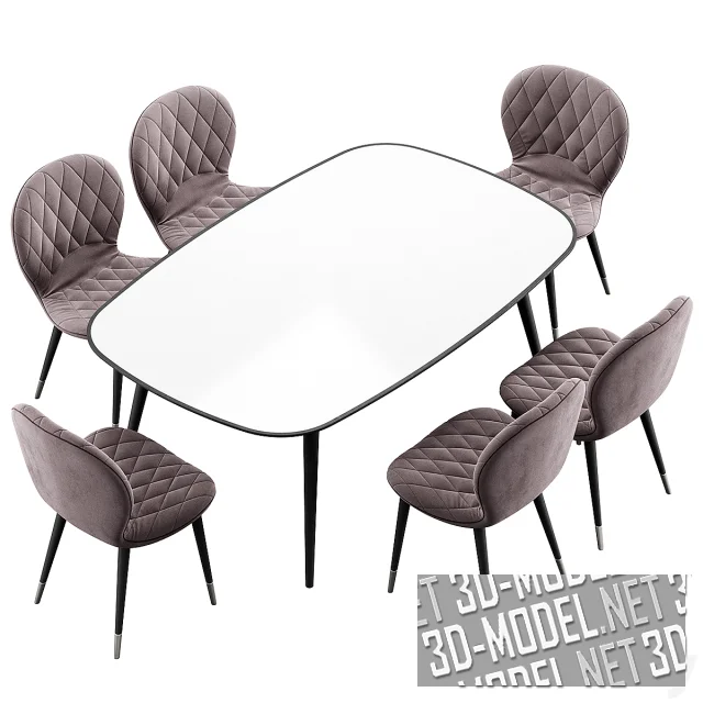 Комплект современной обеденной мебели, в который входит стул Hiro (размер 575X590X900 мм) и стол Konyshev HER 042 G. Габариты стола: 1800x1140xH730 мм. Мебель представлена в двух вариантах отделки.