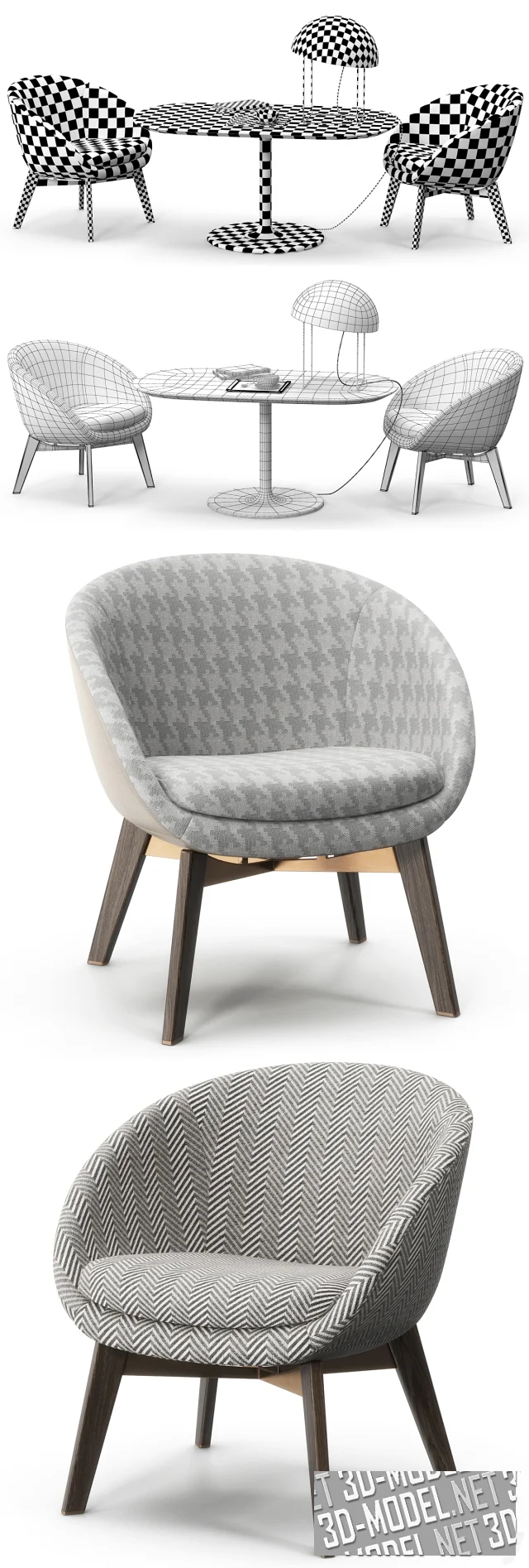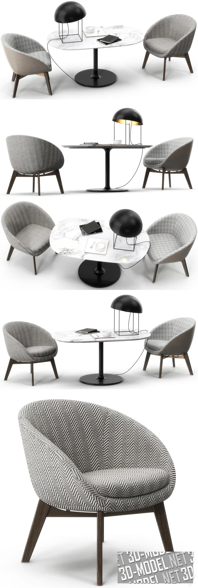 Небольшой набор для гостиной - мебель и аксессуары. В наборе: пара кресел Russel и овальный столик Oliver от Minotti, настольная лампа Coco от almerich, книги, чашка и ложка на квадратном белом подносе. Обивка мягких элементов кресел на деревянных ножках представлена в двух вариациях бело-серых паттернов с геометрическим орнаментом. Овальная столешница - из белого с темными прожилками мрамора, на черной моноопоре с круглой площадкой. Настольный светильник выполнен в виде каркаса из черных металлических прутьев, накрытого крупной черной полусферой рефлектора.