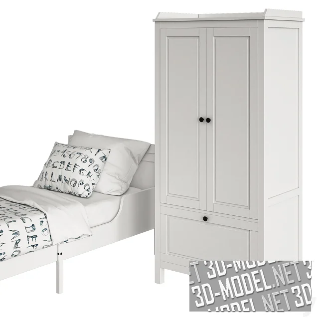 Небольшой комплект современной белой мебели для детской спальни, серия SUNDVIK производства бренда Ikea. В наборе небольшой шкаф с двумя створками и большим выдвижным ящиком внизу и односпальная кровать. Постельное белье скомбинировано из двух видов ткани - белой и декорированной изображением стилизованного алфавита и цифр.