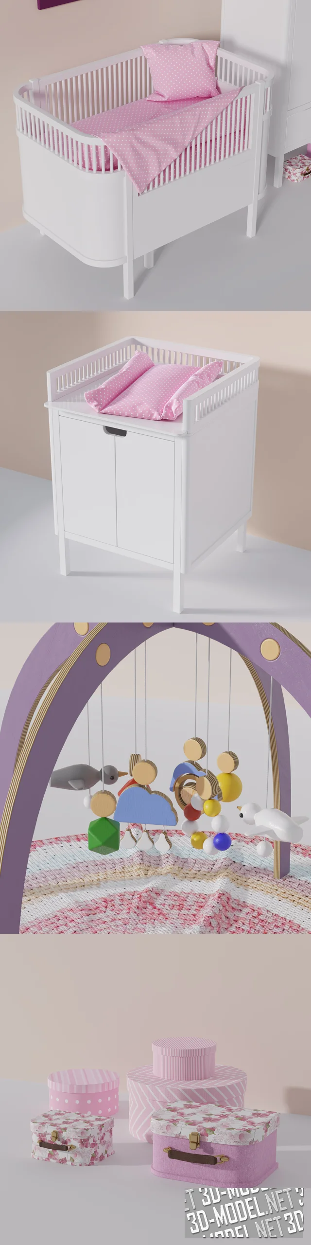 Комплект современной белой мебели от Sebra, в наборе с розовым в мелкий белый горошек текстилем и декором. В комплекте: платяной шкаф, пеленальный стол-тумба, кроватка с высокими бортами, круглый коврик и напольная игрушка в виде пересеченных фиолетовых арок с подвешенными игрушками и погремушками. Мебель дополнена постером в фиолетовой рамке, круглыми картонными розовыми коробками и стилизованными под чемоданы коробками.