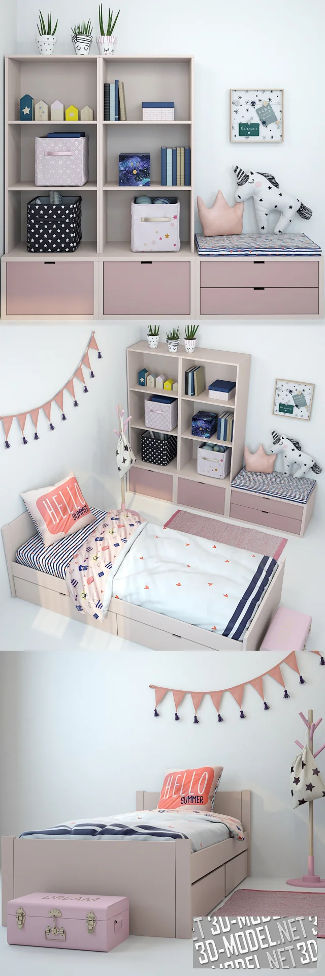 Комплект для наполнения детской спальни. В комплекте: кровать, шкаф с полками, тумба с двумя выдвижными ящиками, декор, аксессуары. Односпальная кровать с двумя выдвижными ящиками для хранения постельного белья, тумба и шкаф выполнены из плит светло-бежевого цвета. Фасады выдвижных ящиков на тумбе и в шкафу - нюдового, светло-розово-коричневого цвета.