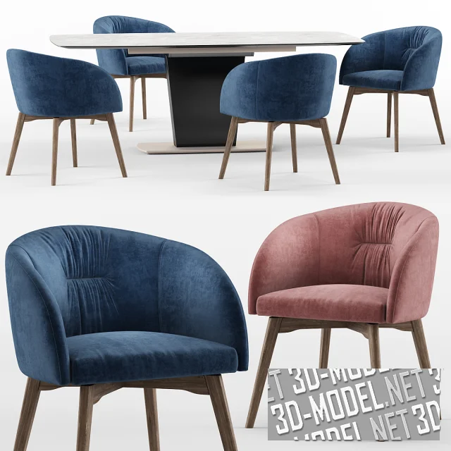 Комплект современной обеденной мебели от calligaris connubia - мягкие стулья Rosie и стол Athos. Мягкие огибающие спинки и мягкие сиденья стульев обиты велюром (бледно-розового или синего цвета) и смонтированы на деревянных ножках. Габарит стульев: 77,5х62,2х61,5см. У стола мощная моноопора темного цвета. Светлая столешница и площадка, на которой стоит моноопора - светлые. Габарит стола: 73х200х100см.