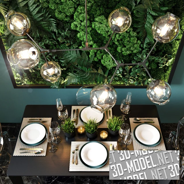 Стол сервирован на четыре персоны и декорирован тремя черными горшками с зеленой травой и свечами в стакане.