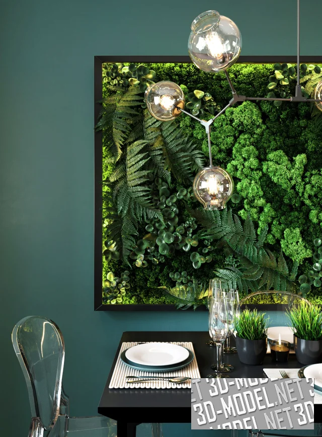 На стене большое фито-панно с зелеными растениями (мхами и папоротником), подсвеченными скрытой подсветкой, смонтированной в черной раме.
