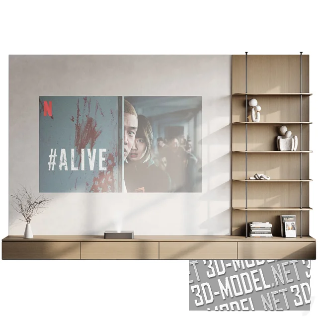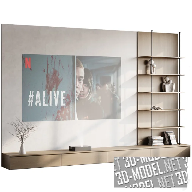 Набор элементов для ТВ-стены с проектором. Изображение проецируется на белую ровную стену. Под проекцией размещена длинная деревянная тумба-подиум с выдвижными ящиками без ручек на глухих фасадах. В правой части композиции предусмотрен пристенный стеллаж с открытыми полками, опирающимися на две металлические стойки. На полках и тумбе белая ваза с сухими ветками, медиа-проектор, книги, абстрактные скульптуры.