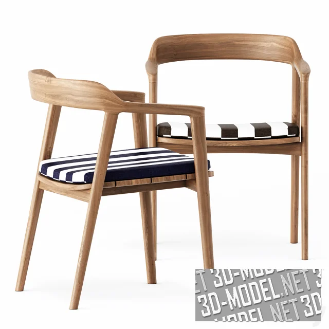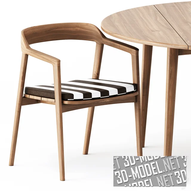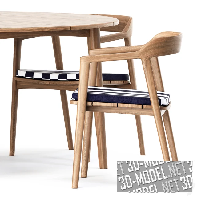 Комплект современной деревянной обеденной мебели KARPENTER GRASSHOPPER (дизайн: Hugues Revuelta). Гладкие деревянные элементы мебели со скругленными кромками, вскрыты матовым прозрачным лаком, обнажающим и подчеркивающим красивую текстуру дерева теплого, бежевого тона. Четырехсоставная круглая столешница диаметром 150см. Высота стола - 75см. Стулья выполнены с невысокой огибающей спинкой, переходящей в подлокотники. Небольшая подушка на деревянном сиденье представлена в чехлах двух видов: в черно-белую и темно-синюю с белой полосками. Габарит стула: 56х53,5х72,5см.