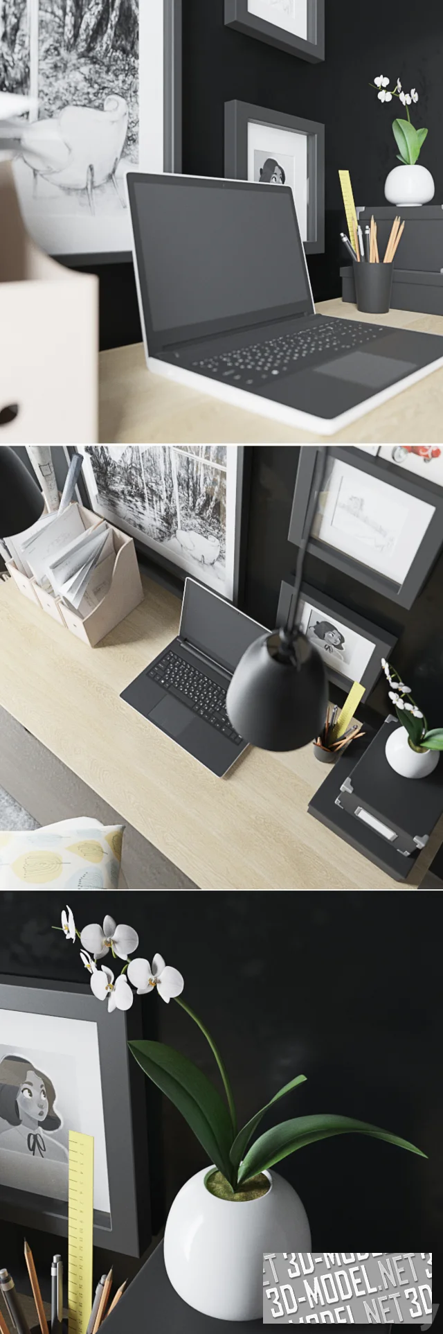 Под столом большой пакет из крафтовой бумаги, заполненный свернутыми постерами. На поверхности стола находится раскрытый ноутбук, холдеры с бумагами, черные коробки, черный стакан с линейкой, карандашами и ручками, горшок с белой орхидеей. Над столом два светильника с черными металлическими колоколами рефлекторов. На стене черно-белые панно в графитово-серых рамках и небольшие художественные работы без рамок. На полу расстелен серый тонкий ковер.