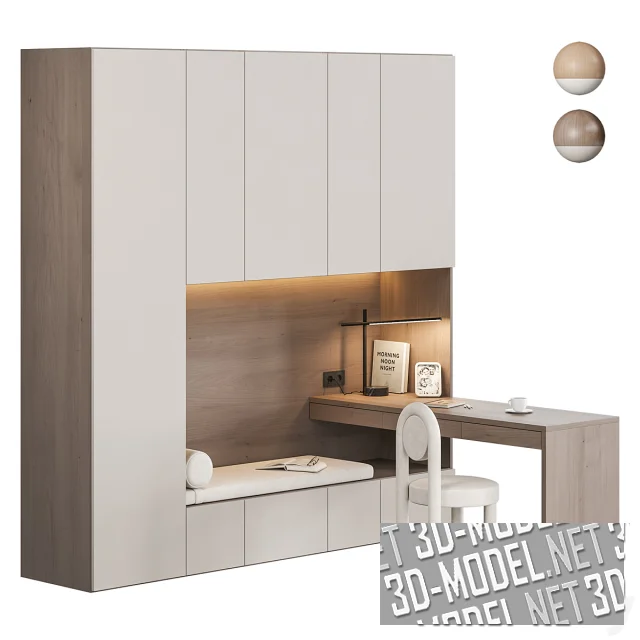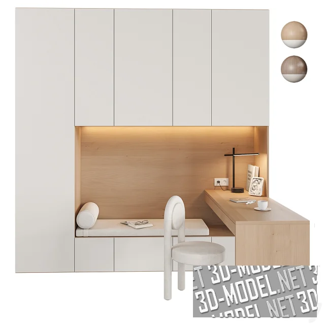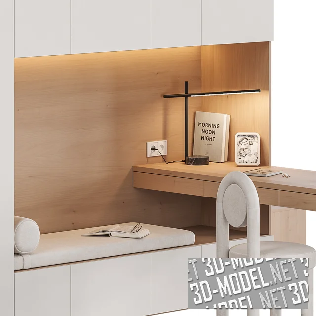 Современное рабочее место. Включает в себя подвесной стол с ящиками, белый стул Sarah от West Elm и большой светлый шкаф с нишей. В нишу вмонтировано место для чтения с мягким белым матрасом и валиком-подушкой. На столе расположены настольная лампа LedsC4 TUBS, чашка чая и книги. Габаритные размеры: D260 W180 H270 см.