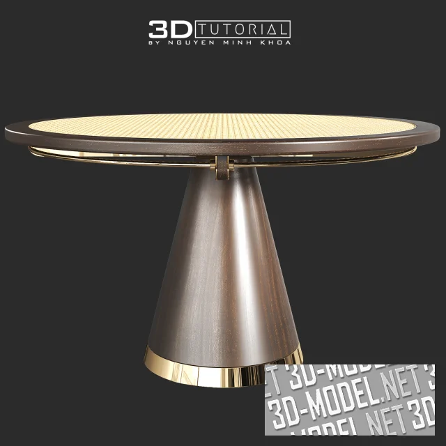 Комплект современной обеденной мебели из дерева, золотистого металла и плетения «Венская соломка». В наборе круглый обеденный стол и полукресло. Центральная конусовидная опора круглого стола и рама столешницы изготовлена из массива дерева, тонированного темным сатиновым лаком. Цоколь опоры и обруч, закрепленный под столешницей, выполнены из золотистого полированного металла. Плоскость столешницы заполнена плетенкой натурального, соломенного цвета.
