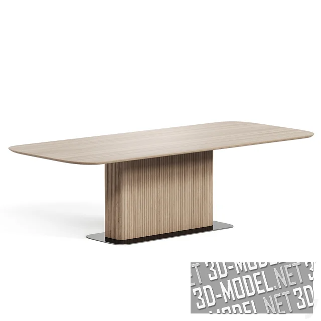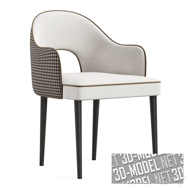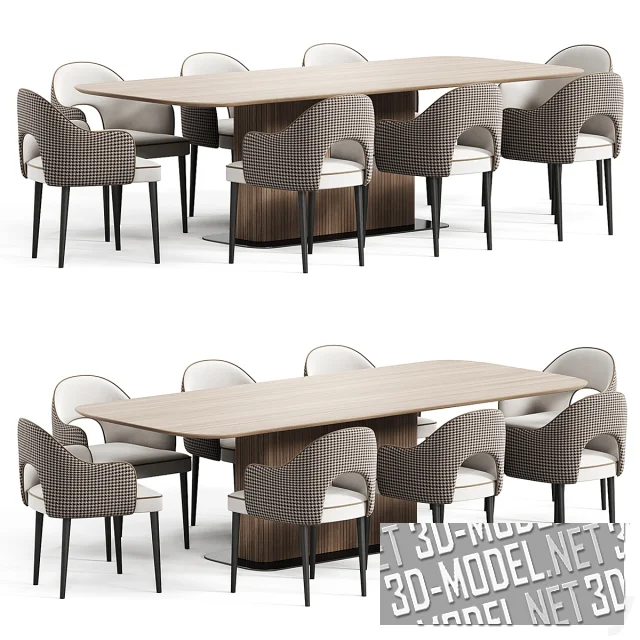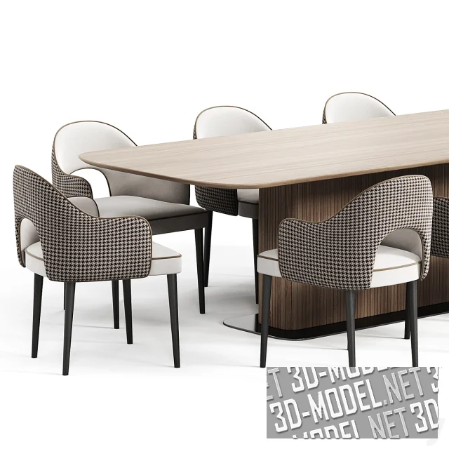 Мягкие обеденные стулья Bradley от Cazarina Interiors и большой прямоугольный обеденный стол Glide от Dantone Home. Углы столешницы с деревянной текстурой скруглены и декорированы фацетой по нижней кромке. Центральная опора стола на гладкой черной площадке со скругленными углами отделана тонкими вертикальными деревянными рейками. Стулья со скругленной огибающей спинкой с полукруглым вырезом в нижней средней части и мягким сиденьем обиты материалом в двух вариантах. Первый - велюровая обивка белого цвета. Второй - белая подушка сиденья и внутренняя плоскость спинки и наружная плоскость с черно-белым паттерном «гусиная лапка». В кромки сиденья и спинки вшиты коричневые шнуры. Габарит стула: 59х55,5х80см. Габарит стола: 253,5х109,5х75,5см.