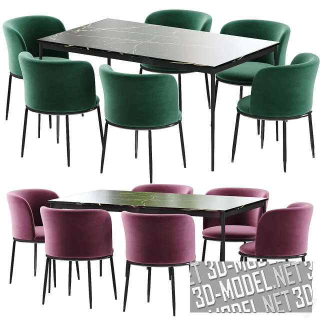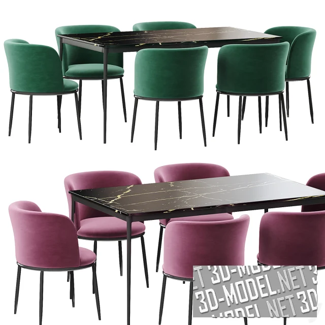 Набор обеденной мебели от Eichholtz - стол Filmore и круглые стулья. Обивка стульев представлена в двух цветах: бледно-бордовом и темно-зеленом. Ножки мебели тонкие, черные, зауженные книзу. Прямоугольная столешница Filmore с текстурой мрамора.