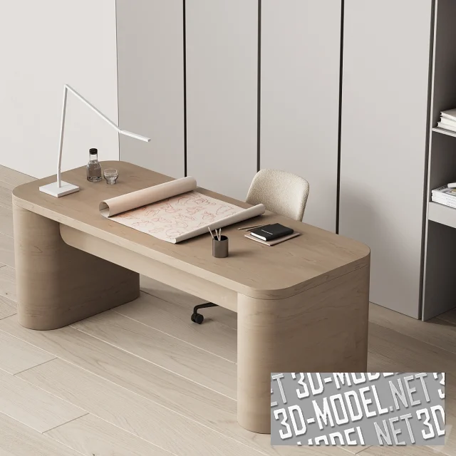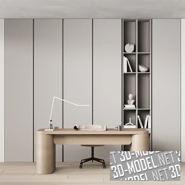Современное рабочее место для работы в офисе и дома. В набор входят: шкаф с полками, стол, стул. Настольная лампа, канцелярские принадлежности, книги и различный декор дополняют комплект.