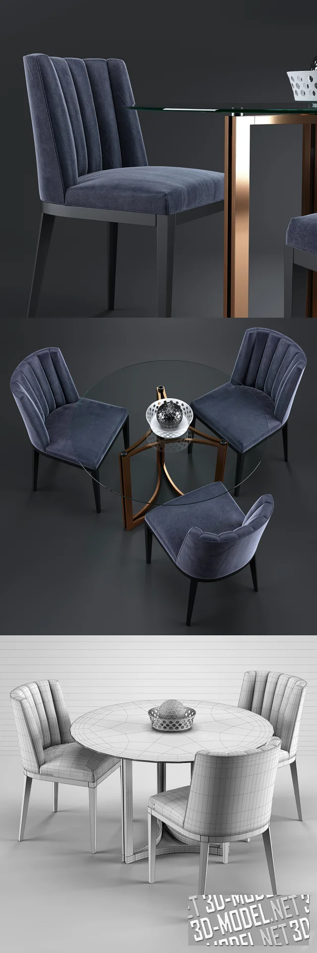 Лаконичный современный комплект обеденной мебели - круглый обеденный стол и стулья Bespoke 418 от Alter London. Стулья с чуть вогнутой, разделенной на вертикальные сегменты мягкой спинкой и мягким сиденьем обиты велюром сине-серого оттенка. Обивка прекрасно сочетается с тонкими деревянными ножками и рамой сиденья черного матового цвета.