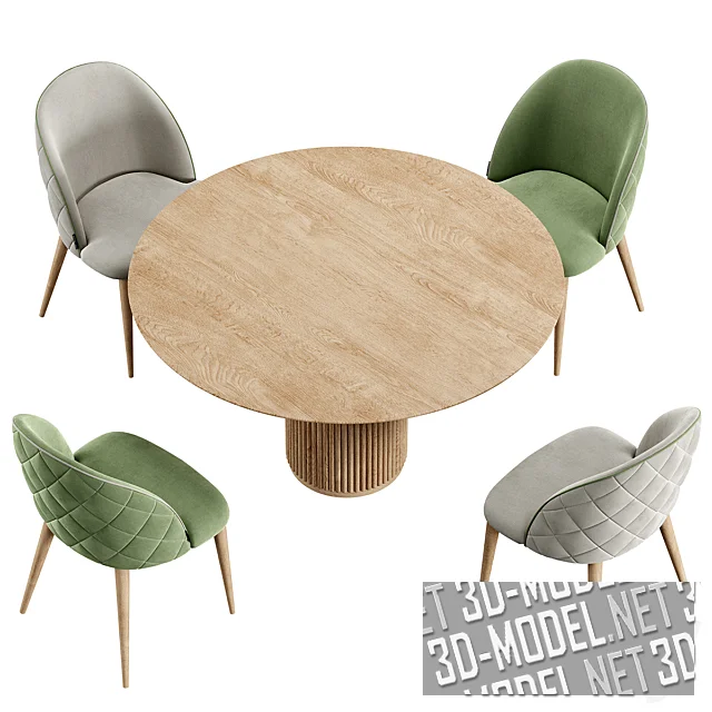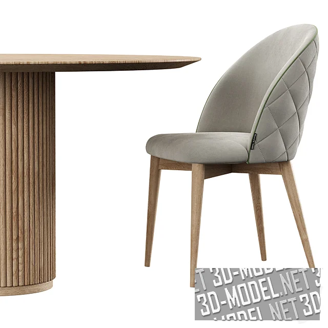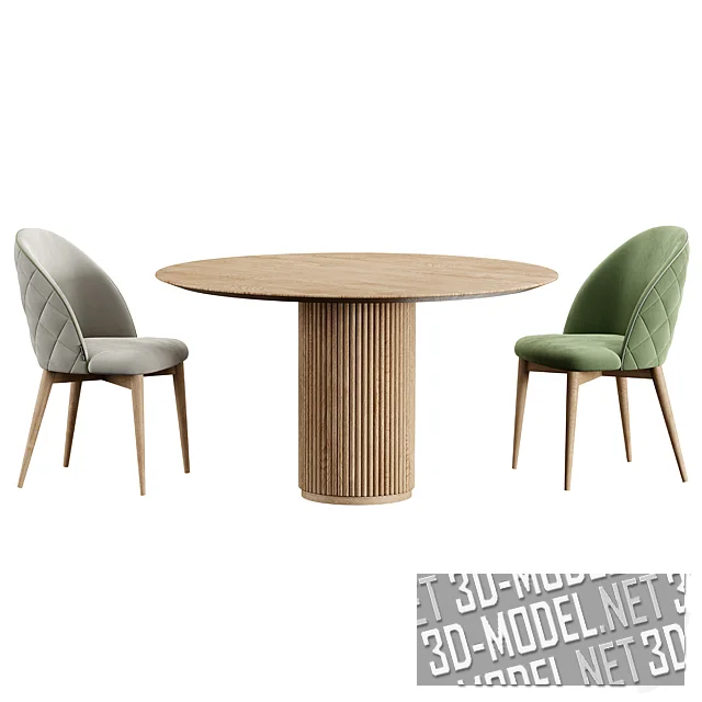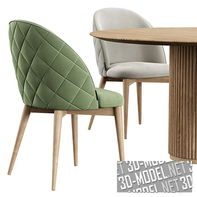 Современный комплект обеденной мебели с деревянным столом PALAIS ROYAL (d130см) и стульями Dijon (51,5x54,5x81см). Круглая массивная опора стола декорирована наборкой из вертикальных цилиндрических жердей. Стулья со скругленной огибающей мягкой спинкой и мягким сиденьем имеют деревянную раму на четырех ножках, зауженных книзу. Мягкая обивка наружной плоскости спинки декорирована прострочкой, разделяющей спинку на квадратные ромбы. Обивка стульев представлена в двух вариантах: светло-серая и оливковая.