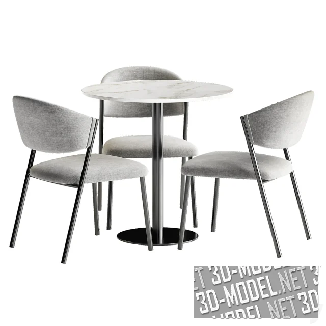 Столешница Elish изготовлена из светлого мрамора, удерживается металлической моноопорой. Сиденье и спинка Rupert обиты мягкой тканью. Набор сочетает в себе привлекательный минималистичный дизайн, практичность и комфорт.