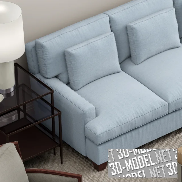 Современный комплект мебели для гостиной BARBARA BARRY Baker. В наборе: прямой трехместный диван в светло-голубой обивке, квадратный деревянный столик с двумя полками, пара журнальных столиков с металлическими каркасами темно-коричневого цвета и стеклянными столешницами, журнальный прямоугольный столик с мягкой кожаной обивкой песочного цвета, большой прямоугольный серый ковер, серое классическое кресло с деревянным каркасом.