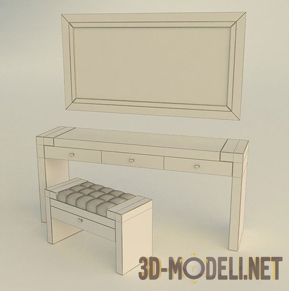 3D модель туалетного столика, пуф и зеркала производства бренда Formitalia, модель Alabama. Размеры: 165 Х 40 х 75 см. Используемые материалы – кожа и массив дерева, металл. Собственно консоль оснащена тремя ящиками, что делает ее очень удобной.