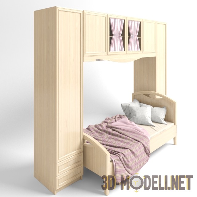 3d-модель набора мебели: кровать и шкаф для детской комнаты. Спокойный и милый комплект, выполнен из светлого дерева. Состоит из двух пеналов, соединенных вверху между собой закрытой полкой-антресолью, и односпальной кроваткой внизу, с тремя подушками и матрасом. Светлое дерево мебели красиво дополняет розово-бежевое клетчатое одеяло и легкие шторы такого же цвета, собранные посередине и закрывающие центральные открытые полки антресоли. Две крайних полки – с дверцами.