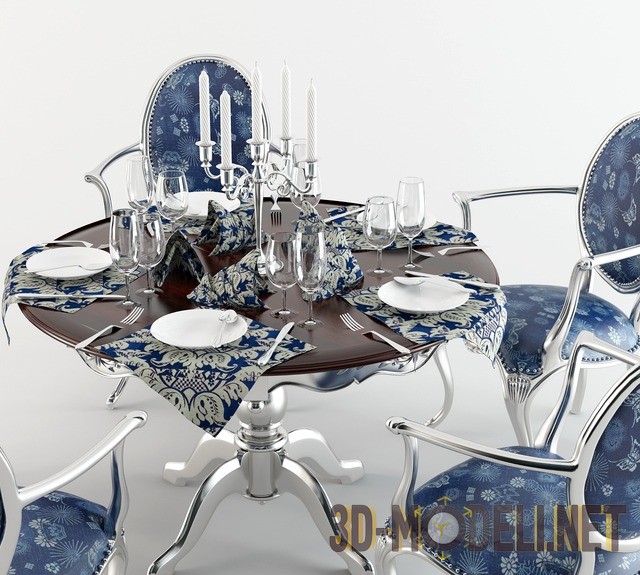 3d-модель роскошного кухонного гарнитура, с элементами стиля рококо в современной интерпретации. В него входят: пять мягких полукресел с подлокотниками и круглый стол на толстой ноге и крестовине. Все деревянные элементы гарнитура (кроме столешницы) отделаны серебристой фольгой и лаком, что придаёт классическим формам ультра-современное звучание. Круглая столешница изготовлена из массива дерева и отделана темным лаком. Мягкие сиденья и спинки полукресел обиты пестрым текстилем с темно-синим фоном и васильково-белым орнаментом. Гарнитур дополнен сервировкой стола, прекрасно сочетающейся с мебелью: серебристый канделябр с пятью белыми свечами и пять приборов, включающих нож, вилку, ложку, тарелку, бокалы и темно-синие с белым салфетки, украшенные дамасским орнаментом.