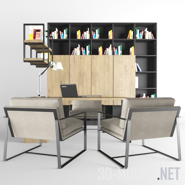 Комплект мебели и аксессуаров для наполнения современного офиса или кабинета. Шкаф с книжными полками скомбинирован из прямых фасадов из светлого дерева и графитового цвета полок и корпуса. Фасады без ручек. Полки заполнены книгами и журналами. Кресла низкие на металлических базах и с серыми мягкими подушками. Минималистичный стол скомбинирован из светлого дерева и металлической рамы графитового цвета. На столе – современный светильник и ноутбук.