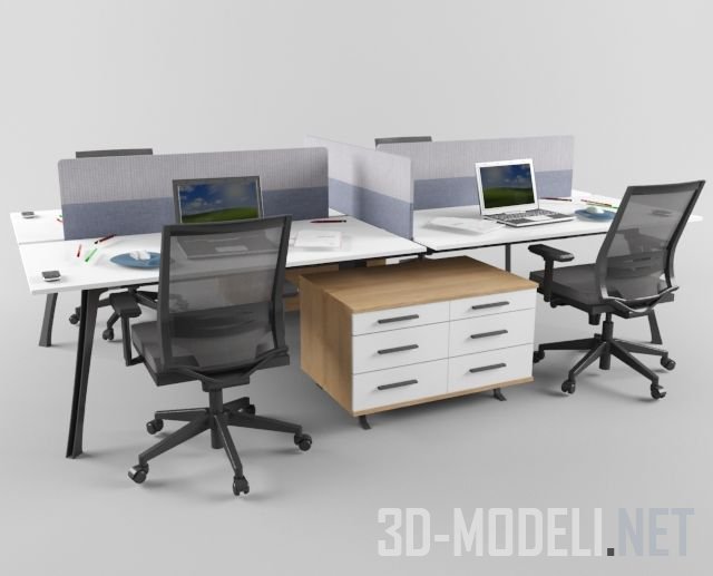 Современная рабочая станция, рассчитанная на четырех человек. Удобный стол и стулья отвечают всем требованиям эргономики. Стулья на роликах. На столе компьютеры и необходимые канцтовары. Текстуры собраны в архиве.