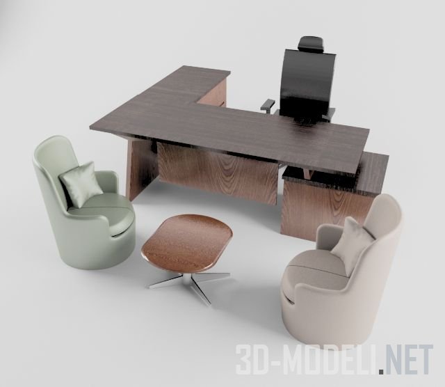 Комплект офисной мебели от Burotime, состоящий из стола с креслом, а также мебельной группы для посетителей. Все предметы отличает современный дизайн, эргономика и комфорт. Модель с текстурами.