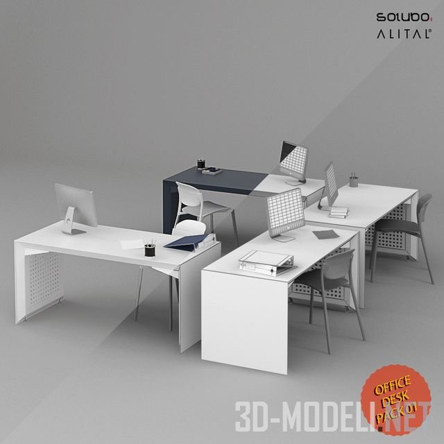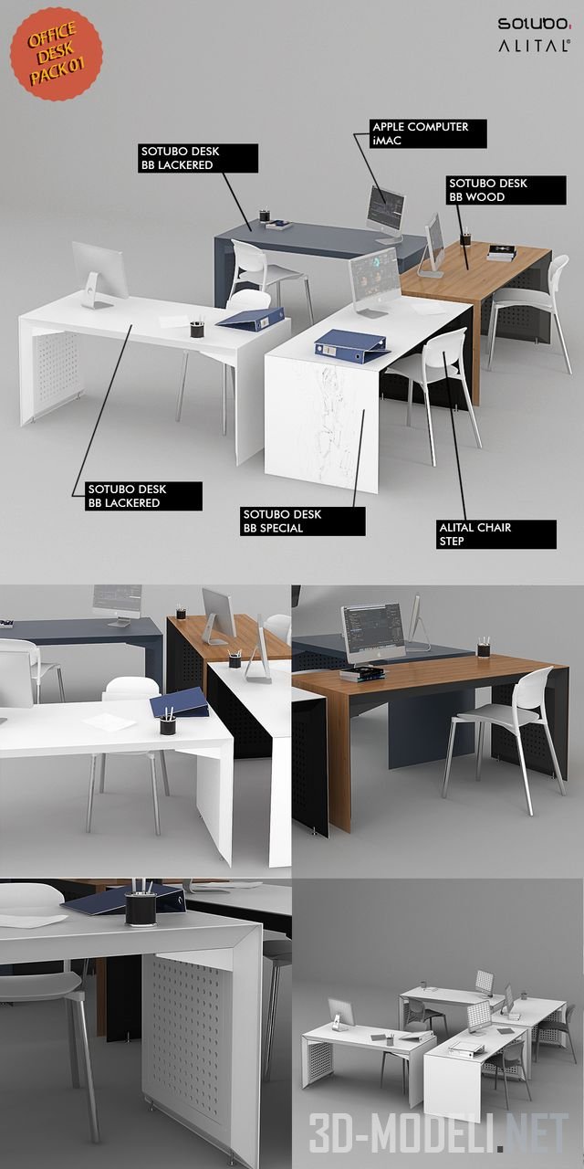 Современный набор офисной мебели, включает в себя стол Sotubo BB Desk table, стул Alital, Apple iMac, различные офисные аксессуары.