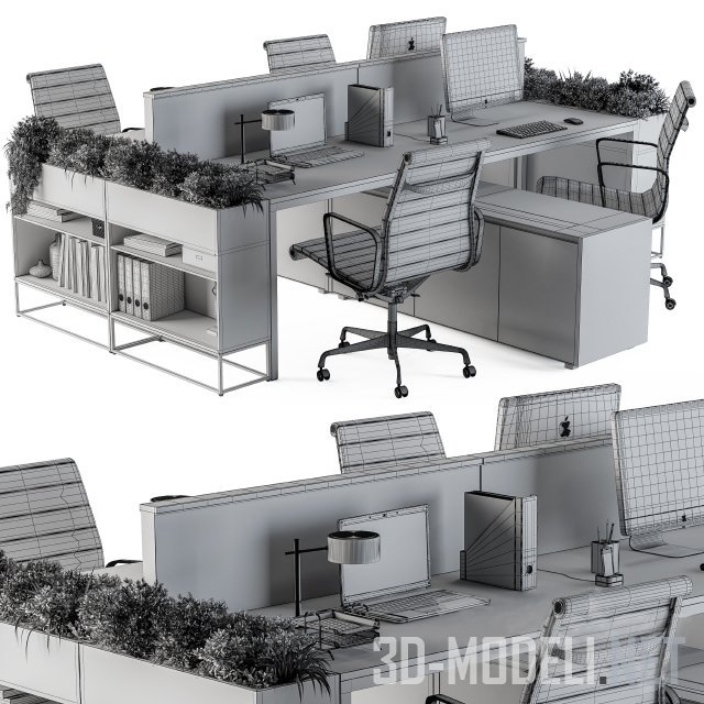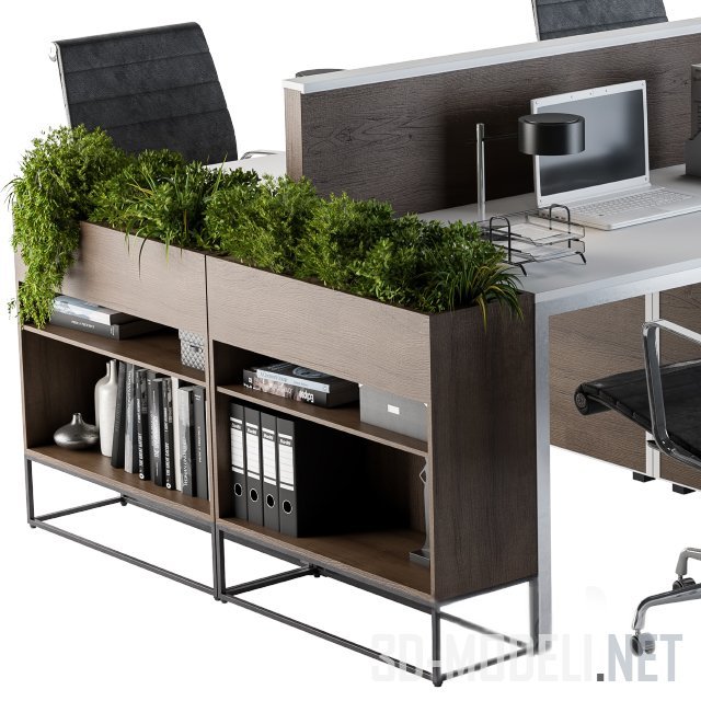 Фрагмент современного офиса с четырьмя рабочими местами (стол, кресло, офисная техника), перегородками и контейнерами с комнатными растениями. В конструкции контейнеров интегрированы полки с папками и аксессуарами. Мебель скомбинирована из плит белого цвета и темной древесины.