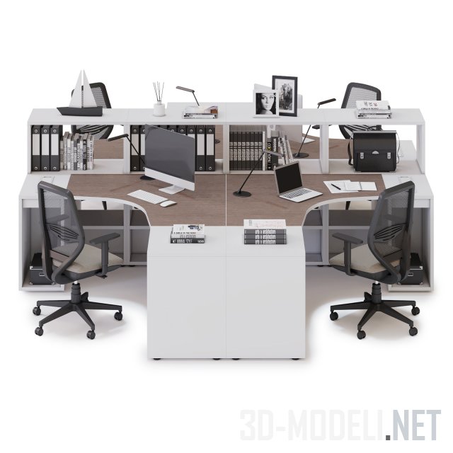 Компактный стол и хранение представляют собой единую систему, а центральный шкаф объединяет два рабочих места. Разные столы, тумбы и пр. позволяют выбрать оптимальную комбинацию для работы.