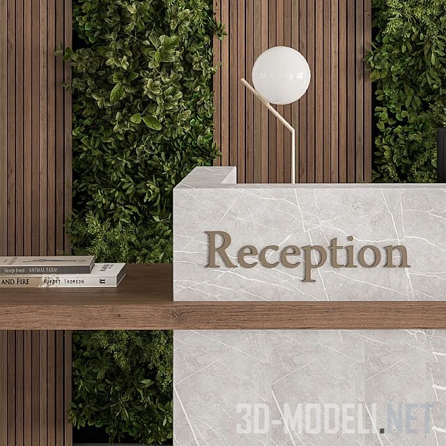 Современная и стильная стойка для регистрации, идеально подходит для интерьера офиса, в качестве места секретаря. Стена за стойкой украшена настенным декором в виде деревянных элементов в сочетании с вертикальным садом.