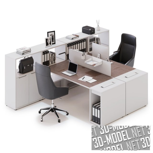 Современная офисная мебель LAS LOGIC 1 с двумя отзеркаленными рабочими местами. Каждый работник обеспечен удобным рабочим столом с секцией под компьютерный системный блок или для хранения бумаг и примыкающим стеллажом с глухими фасадами в нижнем ярусе и открытыми полками на верхнем. Мебель скомбинирована из белых плит и столешницы с текстурой дерева. Черные удобные кожаные кресла на роликах, современные компьютер и ноутбук, канцтовары, книги, папки, лаконичные черные настольные светильники, черный кожаный портфель и фото в рамках - оживляют композицию и наполняют эффектом присутствия.