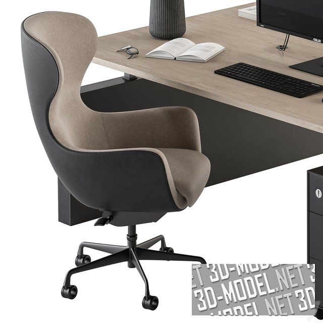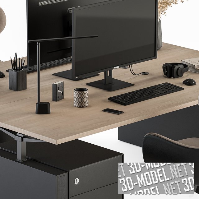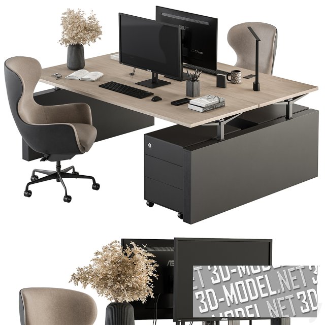 Комплект современной мебели Employee для работы за компьютером. Рабочее место расчитано на два человека, которые будут седеть напротив друг друга. В набор входят: стол, два кресла, выдвижные ящики для хранения документов. Модель дополнена различными реалистичными атрибутами в виде канцелярских предметов и сухих веток в вазе. Комплект подходит для работы в офисе. Но также его можно адаптировать под домашнее рабочее пространство.