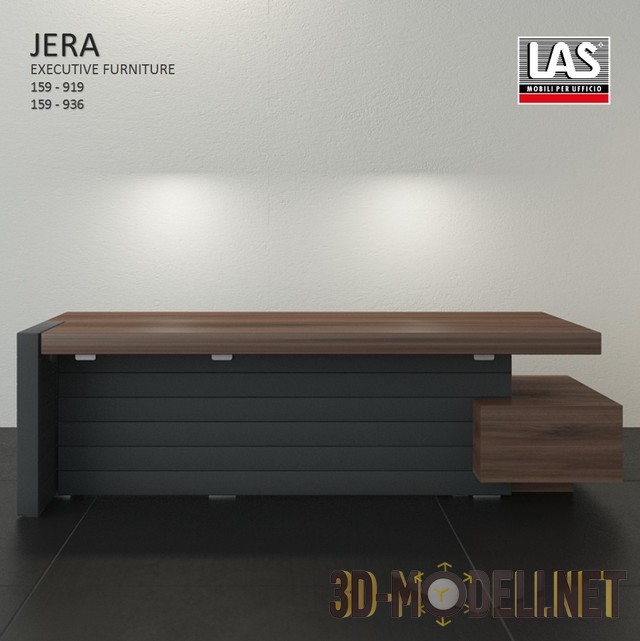 3D модель рабочего стола для офиса, из Jera Collections, производство Las Mobili. Современная мебель для организации рабочего пространства, этот стол задумывался не фиксированным, а с возможностью комбинирования отдельных элементов, что делает модель более функциональной. Это офисный стол в современном стиле, с ящиками и полками. Текстура и файл в формате fbx находится в архиве.