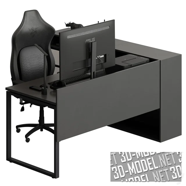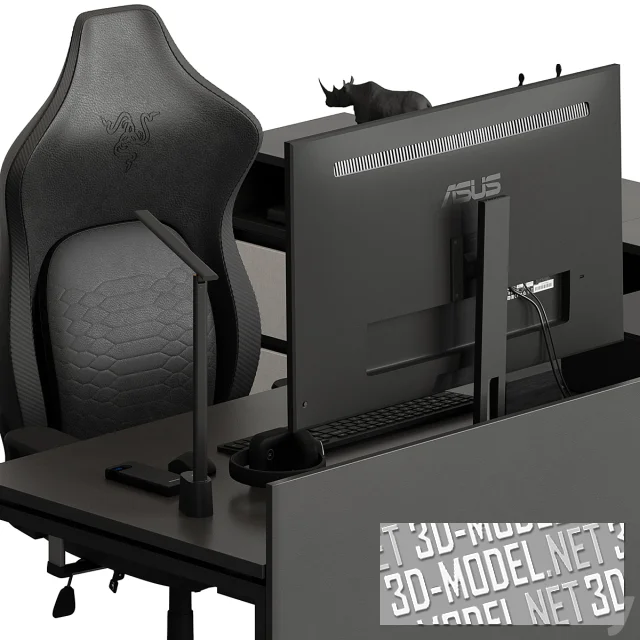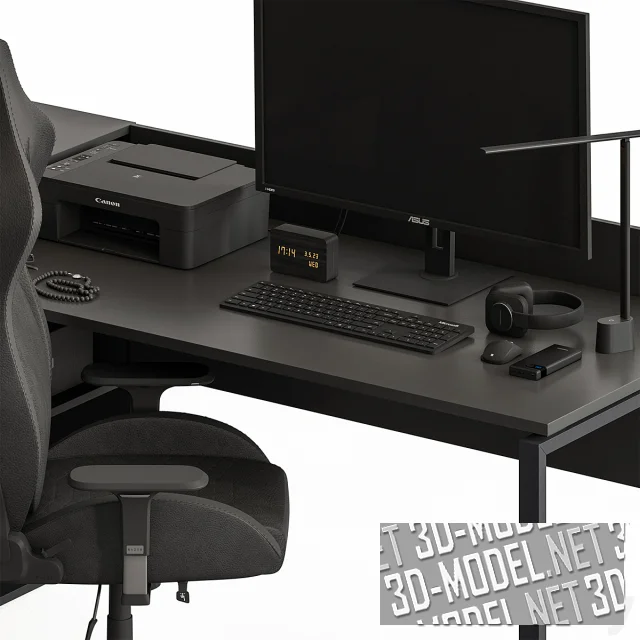Современный рабочий офисный уголок с мебелью в черно-белом сочетании, креслом, оргтехникой и аксессуарами. Удобное компьютерное кресло (производства Razer) - на роликах, с высокой эргономичной спинкой. Рабочий стол и тумба образуют угловую конструкцию. На столе и тумбе: монитор Asus, мышь и клавиатура, настольные электронные часы, наушники, смартфон, принтер Canon, черная минималистичная настольная лампа, книги, папки, бумаги, статуэтки, четки, очки.