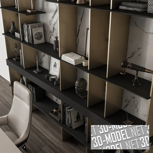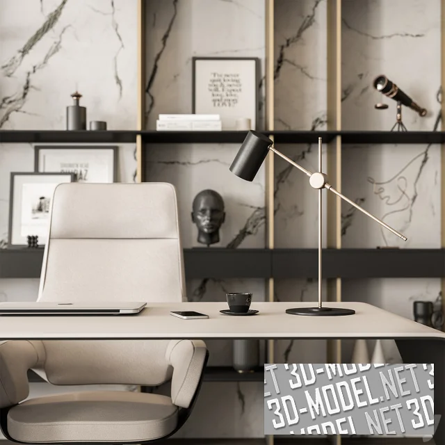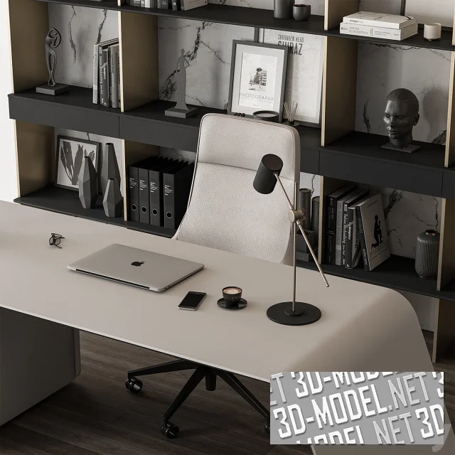Солидный, современный комплект офисной мебели для кабинета директора. В наборе стильный рабочий стол с креслом, а также открытый стеллаж и множество элементов декора и аксессуары. Это настольная лампа, скульптуры, букет, постеры, книги и пр.