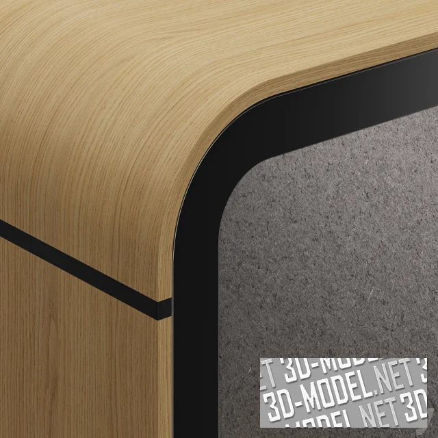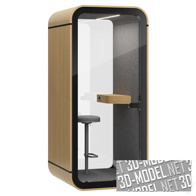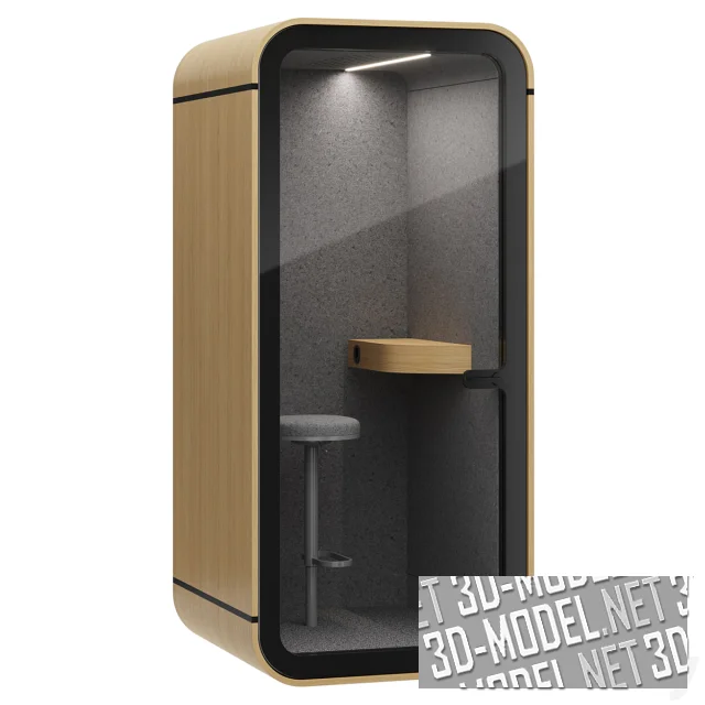 Современная акустическая капсула R1M от Style XO для временного уединения в рамках общественного или офисного пространства. Капсула выполнена в виде вертикальной кабинки со скругленным силуэтом и эстетичной отделкой с текстрой дерева. Внутри оборудован круглый мягкий барный стул и небольшой консольный стол с отделкой под дерево. Стены, пол и потолок отделаны серым звукопоглощающим материалом.