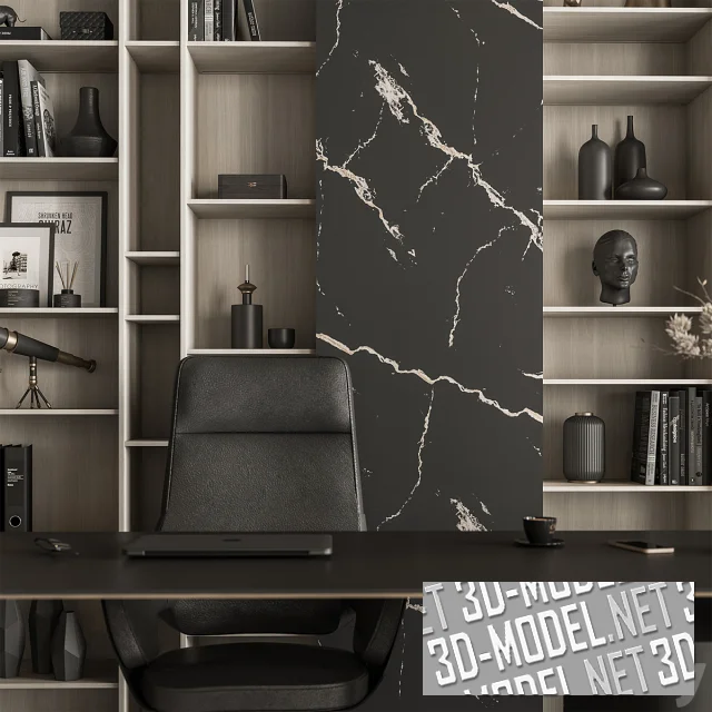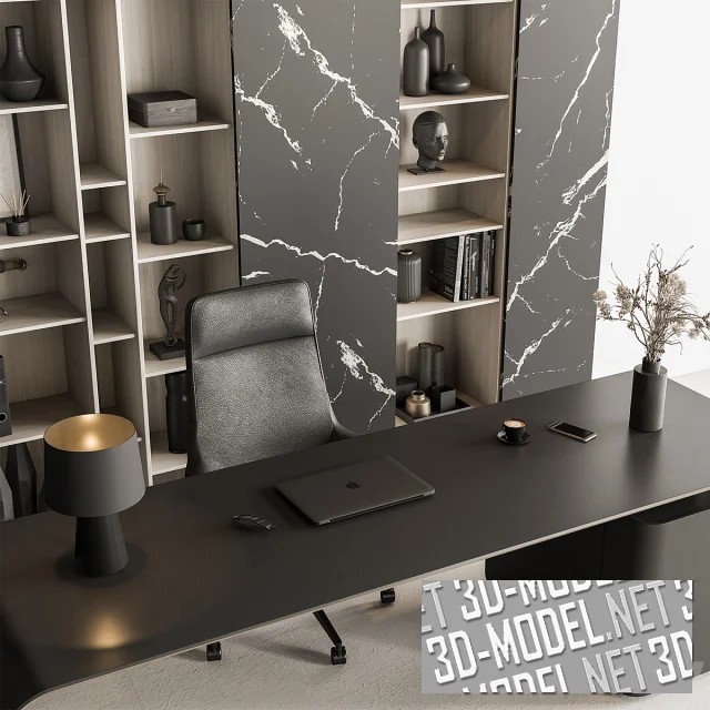 Стильный современный письменный кабинетный стол и офисная мебель. В комплект входит однотумбовый стол и большой пристенный блок с тремя секциями за глухими створками, перемежающимися открытыми полками (на три секции и одну секцию). Высокие глухие створки шкафа декорированы материалом черного цвета с матовой текстурой. Полки заполнены книгами, художественной керамикой, статуэтками и аксессуарами в графитово-черном тоне.